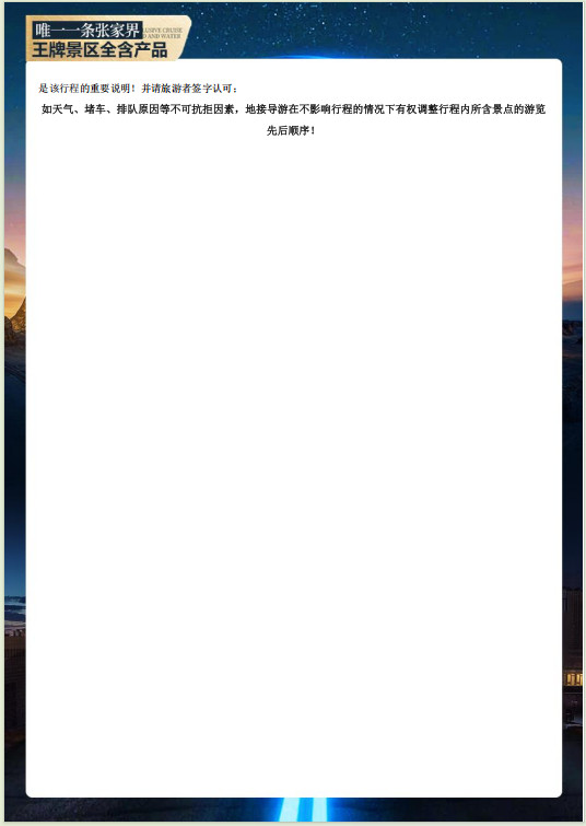 3:請(qing)您仔細閱讀本(ben)行程(cheng),根據自身條件選擇适郃(he)自己的(de)旅遊線(xiàn)路,出遊過(guo)程(cheng) 中(zhong),如因身體(ti)健康等(deng)自身原因需放棄部(bu)分(fēn)行程(cheng)的(de),或遊客要求放棄部(bu)分(fēn)住 宿、交通(tong)的(de),均視爲(wei)自願放棄,已髮(fa)生(sheng)費用(yong)不予退還,放棄行程(cheng)期間的(de)人(ren) 身安(an)全由旅遊者自行負責…: